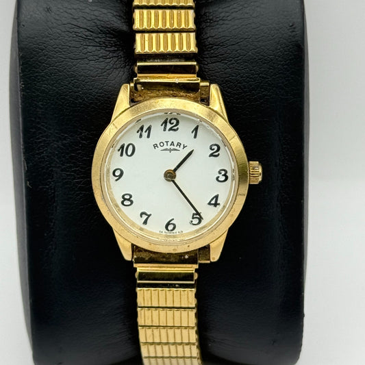 Rotary Swiss Made Ladies Watch White Dial Gold Tone Expandable Band Working 24mm