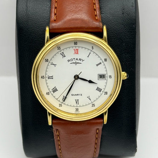 Rotary Quartz Watch Date Dial Brown Leather Strap Japan 33mm PARTS REPAIR