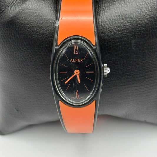 Vintage Alfex Bangle Watch Mechanical Manual Wind Black And Orange Swiss Working